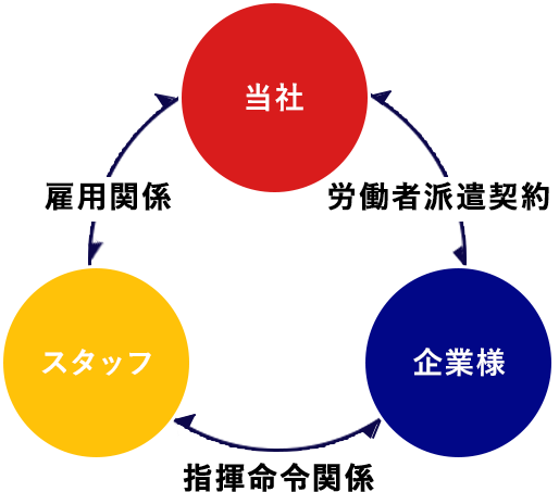 当社(派遣元会社)がスタッフ(労働者)の雇用主となりますが、業務に関わる指揮・命令はお客さま(派遣先企業)によっておこなうこととなります。