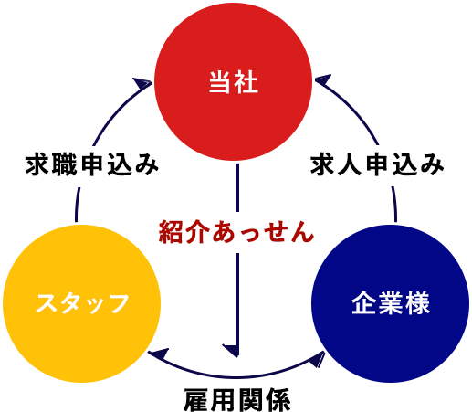 お客さま(求人者)が雇用主となり、スタッフ(求職者)を自社の従業員として働いてもらうことになります。